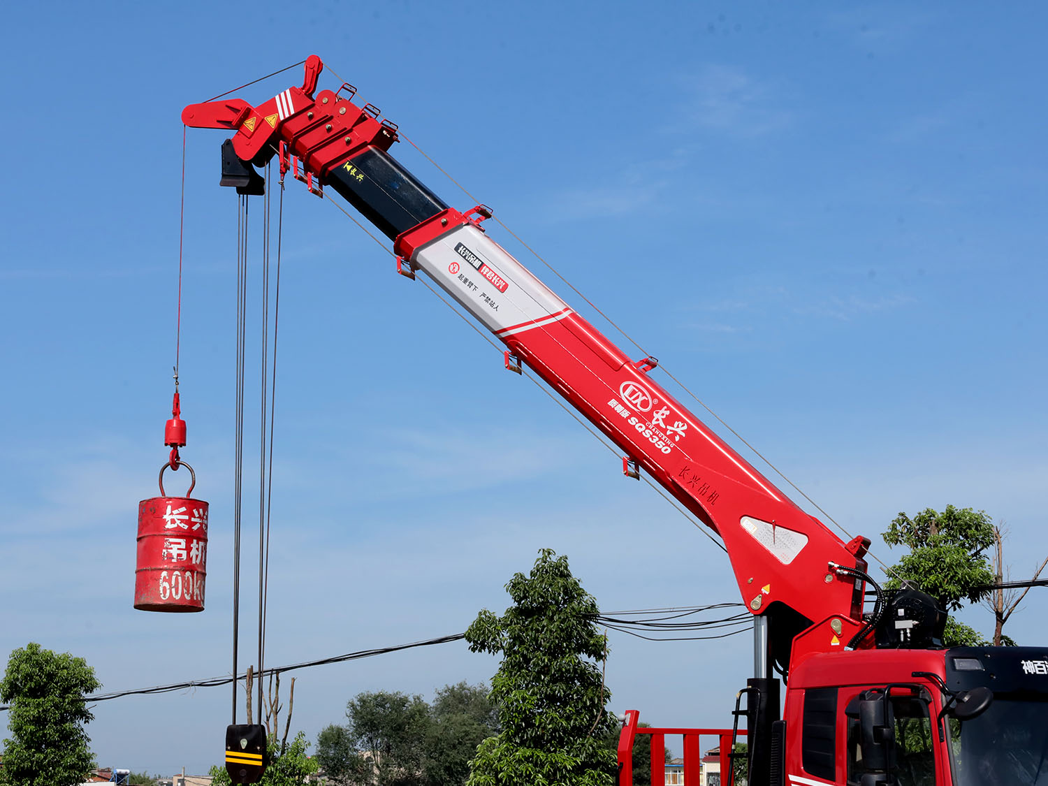陜汽德龍新M3000駕駛室前四后八上裝長(zhǎng)興14噸直臂式吊機(jī)