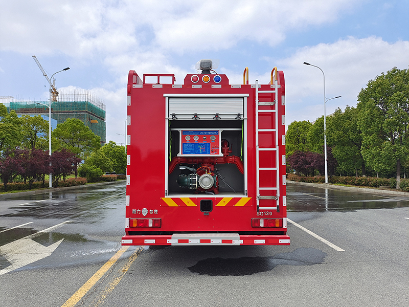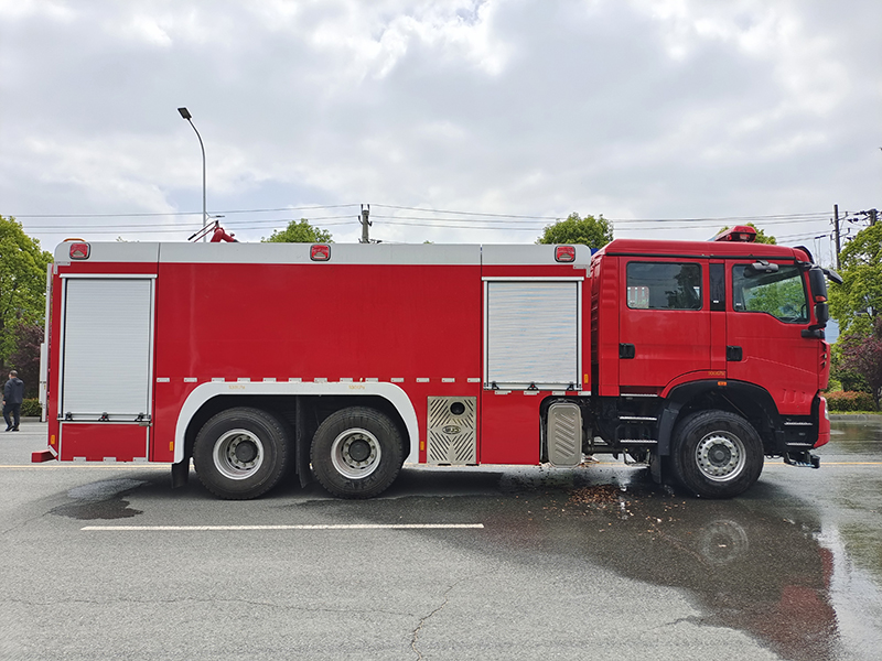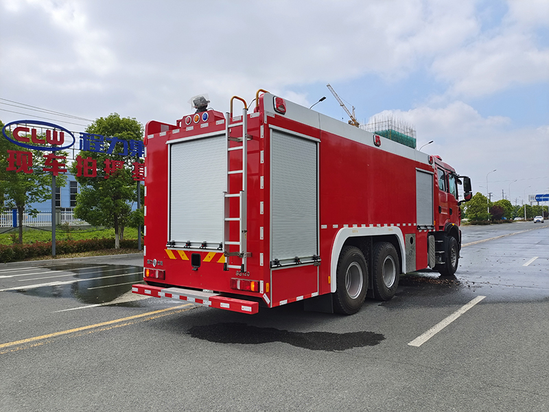 備注:選裝右側安裝不同樣式的裝飾板和選裝后部帶拉梯架裝置。水罐容積為12.200立方米,水罐尺寸:3410×2450×1530mm。整體式側防護結構,后防護裝置材料:Q23**,截面尺寸(高×寬):120×120mm,與車輛連接方式:螺栓連接,后防護離地高度:467mm。ABS生產企業為威伯科(上海)管理有限公司,型號為4460046300。主要專用裝置有CB10/60消防泵、PS50消防炮,水射程≥60m。