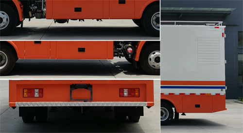 1.該車廂內裝有發電機組,電纜絞盤,液壓(機械)支腿動力電纜,照明系統等設施,主要用于處理突發事件的應急搶險供電;2.車廂頂部封閉不可開啟;3.防護材料:側后防護由車身結構代替,后防護下邊緣離地高:490mm;4.ABS系統型號為XH-KQ4S4M-E01,生產企業為廣州市西合汽車電子裝備有限公司;型號為CM4XL-4S/4M,生產企業為廣州瑞立科密汽車電子股份有限公司;型號為VIE ABS-Ⅱ,生產企業為浙江萬安科技股份有限公司;5.隨底盤選裝駕駛室.