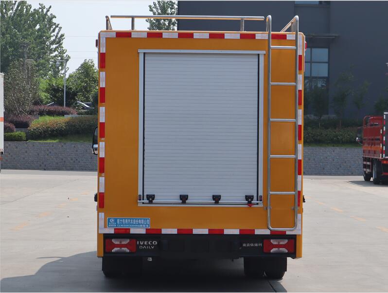 該車配備工程標識燈、發電機組、空壓機、電焊機、等離子系統等專用設備及控制系統,主要用于應急救險救援,應急排水作業; 車廂頂部封閉且不可開啟; 側防護由車身結構代替,后防護材質為Q235A碳鋼,連接方式為焊接連接,后防護截面尺寸(寬×高)(mm):100×220,后部離地高為330mm; ABS系統控制器型號:BOSCH ABS9、BOSCH ESP9, ABS系統控制器生產企業:BOSCH公司; 選裝升降式照明燈,選裝爬梯.