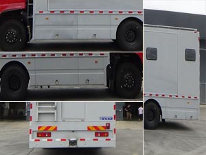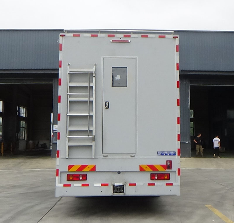車廂頂部封閉,不可開啟。該車主要用于野外住宿,洗漱等野外宿營保障,專用裝置:廂體,床鋪,衛浴; 左右側面及后下部防護均由裙板結構構成,材料Q235,側面下緣離地高度430mm,后下緣離地高460mm;ABS型號:CM4XL;ABS生產企業:長春瑞立科密汽車電子有限公司;整車長度/軸距/前懸/后懸的對應關系為(mm):8850/4500/1440/2910,8850/4500/1475/2875。
