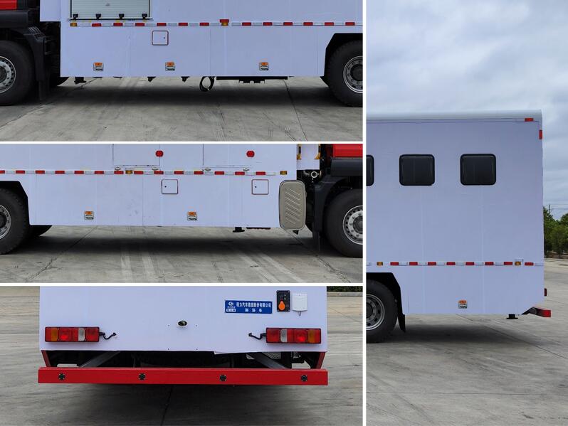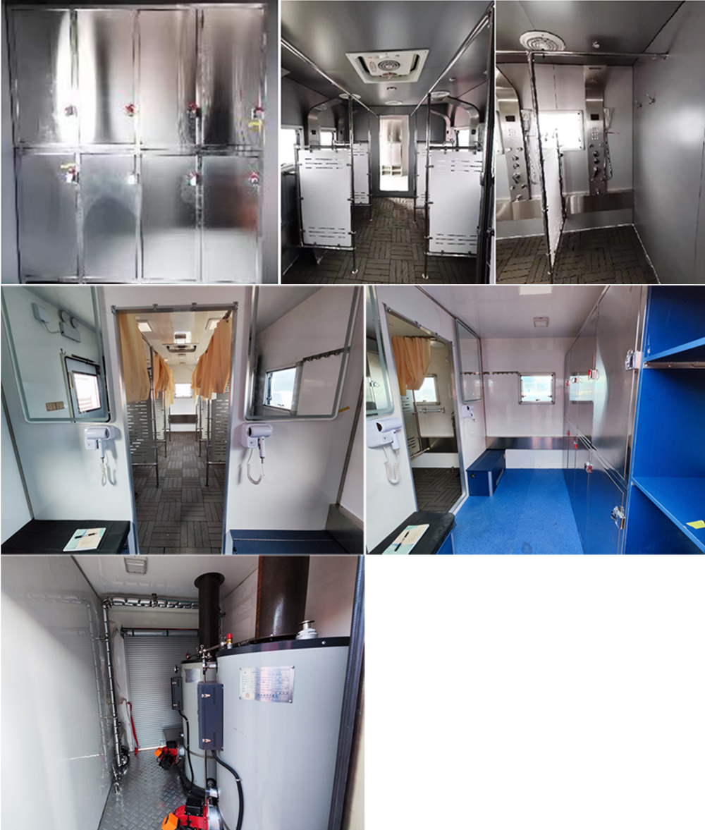 該車主要用于野外淋浴保障功能,專用裝置:冷熱水供給系統(tǒng)、淋浴裝置; 廂體頂部封閉, 不可開(kāi)啟; 僅選用5800mm軸距底盤改裝; 側(cè)防護(hù)裝置為裙邊結(jié)構(gòu)代替,后防護(hù)材質(zhì)為Q235,焊接連接,截面尺寸寬×高(mm):120×120,下邊緣離地高470mm; ABS系統(tǒng)型號(hào)為4460046300,生產(chǎn)企業(yè)為采埃孚商用車系統(tǒng)(青島)有限公司; 選裝內(nèi)部淋浴裝置.