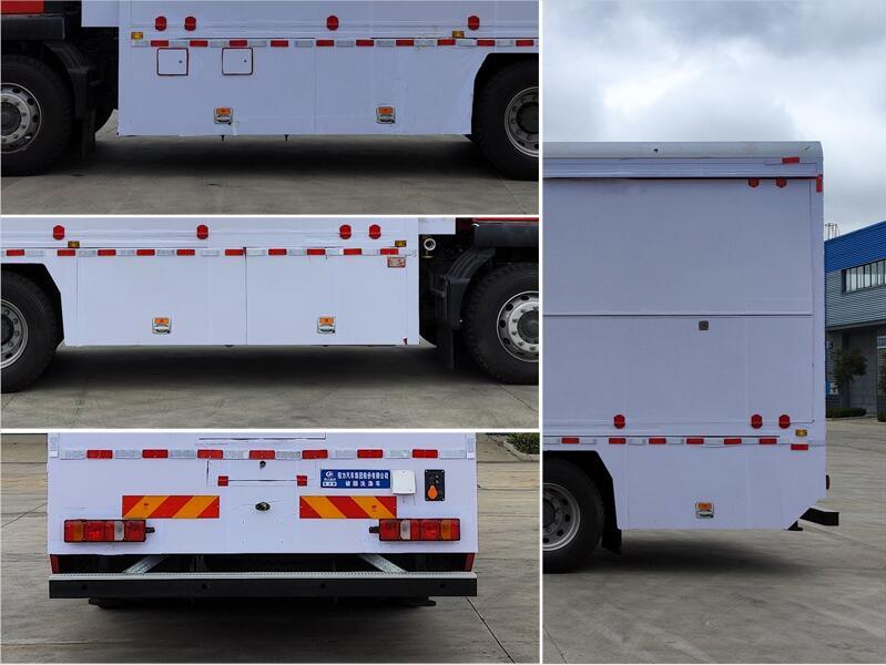 該車主要用于野外條件下被服洗滌工作,主要專用裝置為烘干機、洗衣機等; 僅選用4500mm軸距底盤改裝; 側防護裝置為裙邊結構代替,后防護材質為Q235,焊接連接,截面尺寸寬×高(mm):120×120,下邊緣離地高435mm; ABS系統控制器生產企業/型號為采埃孚商用車系統(青島)有限公司/4460046300;選裝EBS,EBS系統控制器生產企業/型號為采埃孚商用車系統(青島)有限公司/EBS3; 僅在駐車狀態下廂體兩側可擴展,行駛狀態時不可擴展; 選裝帶側窗外觀.