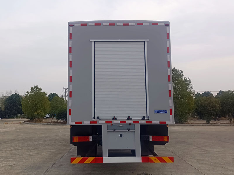 車廂頂部封閉不可開啟;該車用于應急搶險排水作業,配備的專用裝置發電機組、大流量水泵、電氣控制柜等設備。側、后防護裝置材料材質均為Q235A碳鋼;連接方式:側后防護均采用焊接連接,后防護截面尺寸:120×60(mm),下邊緣離地高:400mm;ABS型號/生產廠家:ABS 8/東科克諾爾商用車制動系統(十堰)有限公司。